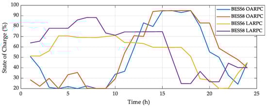 Secondly, the two BESS are scheduled individually with the objective of flattening the load curve at their connection bus. In this regard, the proposed ISCA is applied for solving the two optimization problems. The SOC resulting from applying the local strategy is presented in Figure 10 in comparison with the SOC obtained by applying the OARPC. The results reveal that under the local strategy, both BESS are charging during the first part of the day, when the load demand is low in order to assure the load curve flattening, without considering the PVPP and WPP generation.