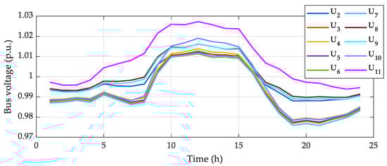 In this section, the OARPC effect on the microgrid operation in terms of voltage profile, reactive power import, and active power losses is analysed. Firstly, the bus voltage profile for each microgrid bus, operating under the OARPC strategy, is presented in Figure 11, while a comparison between the hourly minimum, average and maximum bus voltage is presented in Figure 12.