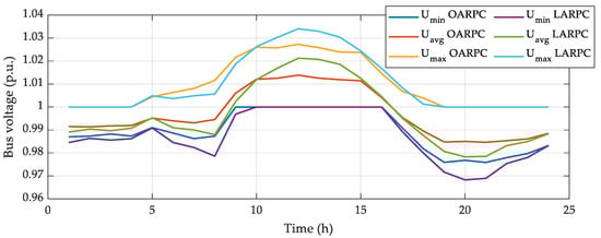 Hourly minimum, average and maximum voltage profiles comparison between OARPC and LARPC.