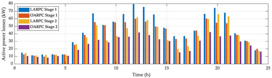 Hourly active power losses profile comparison for both stages of OARPC and LARPC.