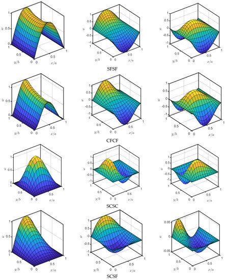 The superscripts indicate the first derivative and second derivatives, respectively, w.r.t. To have nontrivial solutions (Eigenfrequencies, ) for the free vibration analysis, it is essential to ignore the in-plane forces, in Equations (46)–(49). The boundary conditions used are presented in Appendix A.