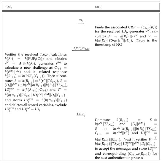 - Step three: When the messages are received, verifies the received and, given , calculates and obtains . Following that, it verifies V before generating a random number in order to calculate a new challenge as . Then it computes , , and . Finally it transfers to NG, stores new and deletes all stored variables, exclude and .
