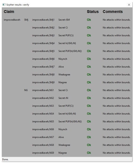 To verify the security of the proposed protocol formally, it has been modeled using SPDL and verified by the Scyther tool [33]. The evaluation results are represented in Figure 2, which confirms the security of the proposed protocol.