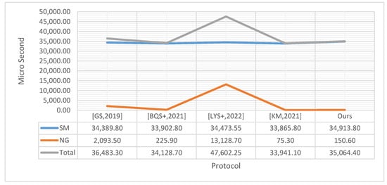 The details of each protocol computation and the approximate computation time based on the above-mentioned setup are provided in Table 3 and also depicted in Figure 3. Following the provided comparison, the overhead of the proposed protocol compared to the KM-protocol is only 4.85%, which is acceptable compared to the provided security level.