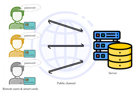 Many two-factor smart-card-based remote authentication schemes have been proposed. Figure 1 depicts the general architecture of the two-factor authentication scheme, which consists of multiple users and a single server. In this system, the remote user must register with a valid identity and secret password with the server. Next, the server issues a legal smart card to the first-time registered user to access the required services. The smart card is employed to store the registered userβs secret credentials for future login requests and perform cryptographic computations during the authentication process.