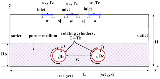 J-I cooling of double RCs embedded in the porous region is explored numerically, while a schematic view is given in Figure 1. Two identical hot cylinders which are kept temperature of Th are embedded in the porous region with a porosity of and permeability of K. The J-I cooling system includes three identical slots of width w = 0.01 m which are separated by the distance sj = 5 w. The distance between the inlet and the bottom plate is H = 10 w, while the porous layer height is Hp = 0.6 H and the plate length is L = 150 w. The cylinder radius is Rc = 0.3 Hp and the distance between them is sc. They are rotating with a speed of in a clockwise direction. The cylinder center locations are (xc1, yc1) for the first cylinder and (xc2, yc2) for the second cylinder. The horizontal locations are xc1 = 0.48L, xc2 = xc1 + sc + 2Rc, while the vertical locations are yc1 = yc2 = 0.5 Hp.