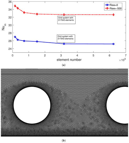 A mesh independence test (MIT) is conducted, considering that various grid systems have different numbers of mixed type (triangular + quadrilateral) elements. Figure 2a shows the average Nu variations with various grid sizes at two different rotations of the cylinders. The grid system with 317,943 elements is selected. The mesh distribution is shown in Figure 2b where it is refined towards the interfaces and near the walls.