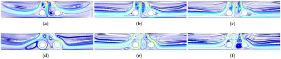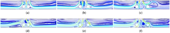 Impacts of distance between the hot cylinders on the streamline variations at two different Rew (Re = 300, Da = 0.01, HNF-2%). (a) Sc = Rc, Rew = 0; (b) sc = 3Rc, Rew = 0; (c) sc = 5Rc, Rew = 0; (d) sc = Rc, Rew = −500; (e) sc = 3Rc, Rew = −500; (f) sc = 5Rc, Rew = −500.