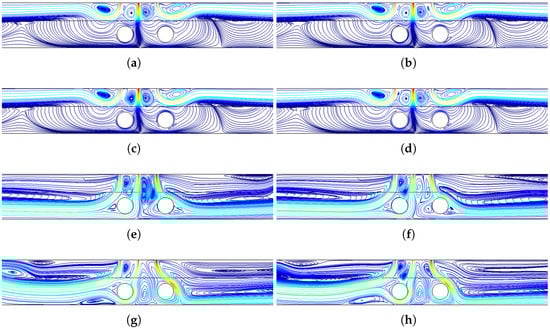 Effects of Rew on streamline variations at two different permeabilities of the embedded zone (Re = 300, sc = 3Rc, HNF-2%). (a) Rew = −100, Da = 0.0001; (b) Rew = −200, Da = 0.0001; (c) Rew = −400, Da = 0.0001; (d) Rew = −500, Da = 0.0001; (e) Rew = −100, Da = 0.1; (f) Rew = −200, Da = 0.1; (g) Rew = −400, Da = 0.1; (h) Rew = −500, Da = 0.1