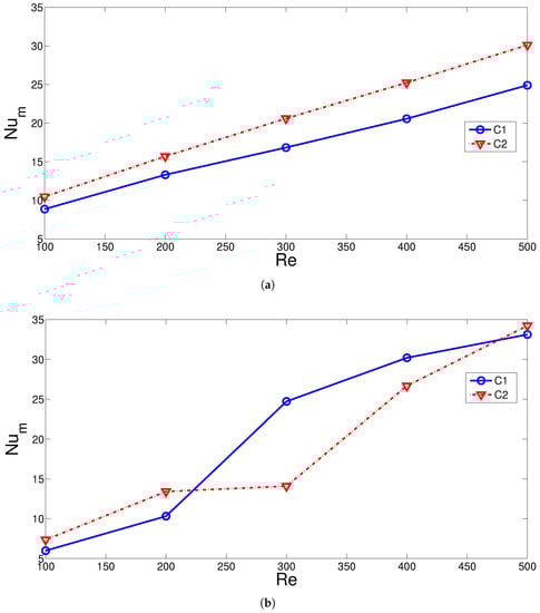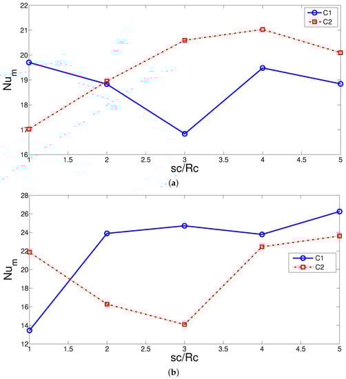 Average Nu variations with varying distances between the hot cylinders for hot cylinder C1 and C2 at two different Rew (Re = 300, Da = 0.01, HNF-2%). (a) Rew = 0; (b) Rew = −500.