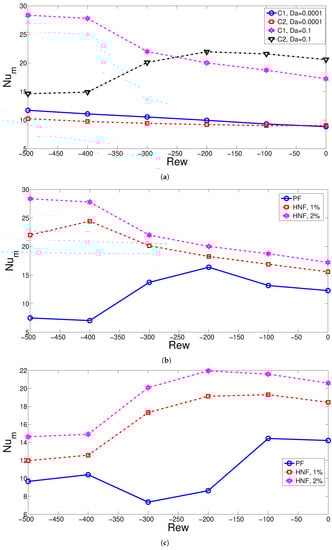 Impacts of Rew on the average Nu variations of hot cylinders C1 and C2 considering different permeability of the cylinders (a) and considering different fluids (b,c) (Re = 300, sc = 3Rc). (a) HNF-2%; (b) C1, Da = 0.01; (c) C2, Da = 0.01.