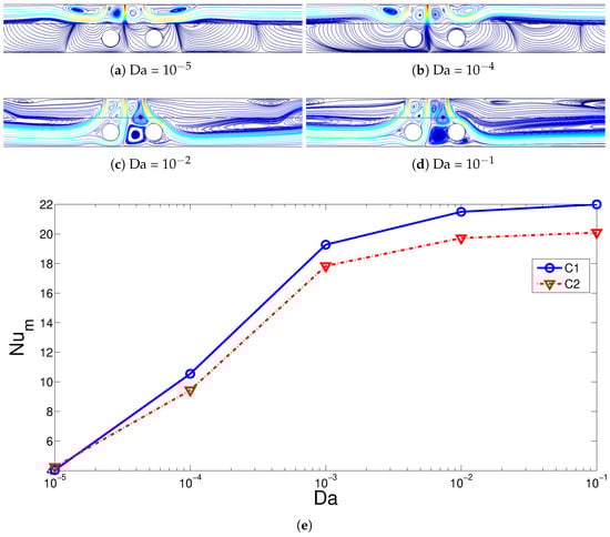 Effects of permeability of the embedded region on the streamline variations (a–d) and average Nu variations for hot cylinders C1 and C2 (e) (Re = 300, Rew = −300, sc = 3Rc, HNF-2%).