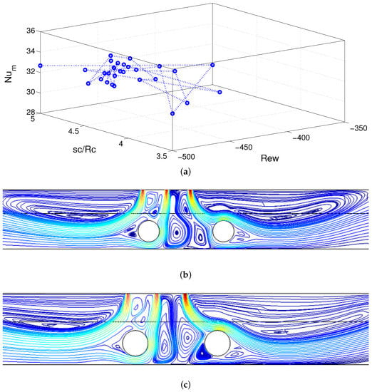 The search for the maximum of the objective function in the range of relevant parameters is shown in Figure 10a. The optimum values of Rew and sc are found as (Rew, sc) = (−483,4.425Rc). At this operating point, the average Nu from cylinders C1 and C2 are found as 36.13 and 33.35, while the overall Nu is found as 34.74. When parametric CFD is used, the highest overall Nu is obtained as 32.67 for the operating point of (Rew, sc) = (−500, 5Rc). In this case, average Nu from cylinders C1 and C2 become 34.6 and 30.75, respectively. Comparison of streamlines between the parametric CFD and optimum operating point is shown in Figure 10b,c. The obtained average Nu at the optimum is higher for C1 and higher for C2 when compared to the best case of parametric CFD.