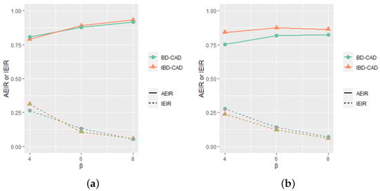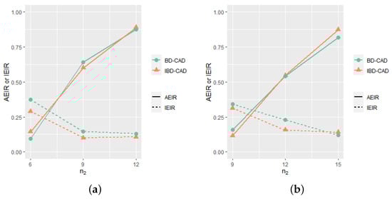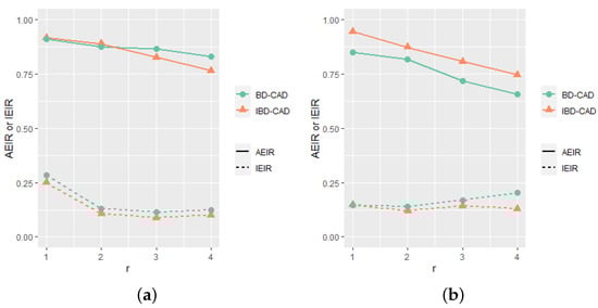 As far as IEIR is concerned, IEIR values obtained by IBD-CADs are generally lower in three figures; thus, we conclude that the IBD-CAD is preferable to BD-CAD in most circumstances. Especially, in Figure 1b and Figure 3b, all AEIR values of IBD-CADs are higher than those obtained by BD-CADs and all IEIR values of IBD-CADs are lower than those obtained by BD-CADs, so the IBD-CAD is more suitable for the second-stage experiment in the case of the initial design SSD with the true model including a two-factor interaction.