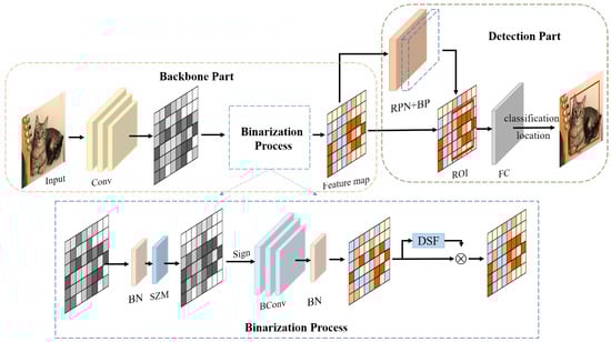 The deep neural network can be compressed by quantification [8,9], efficient structure design [10,11,12], and pruning [13,14] to obtain lightweight models. Binary convolutional neural network (BNN) is the most extreme network quantification method, which not only reduces the memory footprint, but also greatly accelerates the network computing speed [15,16]. However, the efficiency and lightness of BNN comes at the cost of performance loss, which makes it hard to accomplish complex object detection tasks.