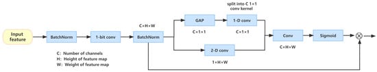 In order to calculate the scale factor of the channel dimension, we consider the feature map from two perspectives: intra-channel and inter-channel. First, we introduce global average pooling to reduce the spatial dimension and the number of parameters, which integrates global spatial information while extracting features. Secondly, considering the interaction between channels, we use one-dimensional convolution to fuse the information of each channel with that of its adjacent channels (). For the scale factor of the spatial dimension, we use a two-dimensional convolutional kernel to extract the feature of spatial dimension (). Finally, we decompose the one-dimensional channel eigenvector into c convolutional kernels and convolute the extracted -dimensional spatial scale matrix to obtain the solution matrix of the scale factor (). Furthermore, since the full-precision convolutional parameter is usually close to zero, the result of binary convolution is usually much larger than that of real-value convolution. In order to control the size of the scale factor and ensure that the scale factor does not change the convolutional symbol, a sigmoid function is introduced. This process can be expressed as: