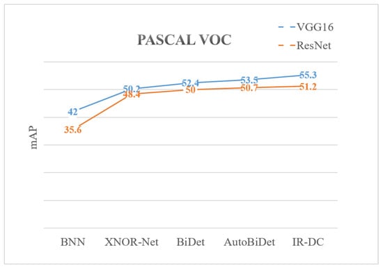As shown in Table 8, we evaluate the kernel bit width, parameter size, and average precision to compare the performance of several object detection methods on the PASCAL VOC dataset. We apply VGG16 and ResNet20 as the backbone networks to correspond to two different frameworks (SSD and Faster R-CNN). Meanwhile, we compare the quantitative methods with BNN (binary), BiDet (binary), AutoBiDet (binary) [43], Xnor-Net (binary), and IR-DC Net (binary). We can notice the improvement of IR-DC net from Figure 5 intuitively.