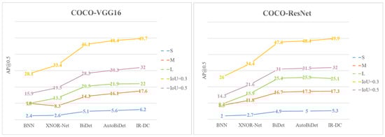 Table 9 shows the comparison results on COCO2014. We provide various variations for average precision such as small object (S), medium object (M), and large object (L), and the IoU is set as 0.3, 0.5, respectively. Following the PASCAL VOC experiment, we choose BNN, BiDet, AutoBiDet, Xnor-Net, and our proposed IR-DC Net with two different backbone networks, VGG16 and ResNet20. As shown in Figure 6, we also provide a line chart to make our results more contrastive.