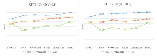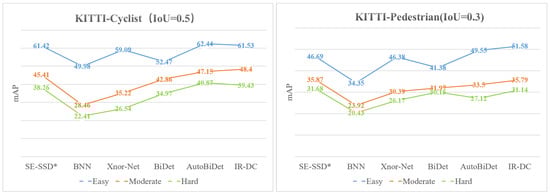 Table 4, Table 5 and Table 6 show the performance comparison of multiple object detection methods on the KITTI 2D Object Detection Evaluation 2012 dataset, and the evaluation metric is the average accuracy. We choose the SE-SSD [44] network as the full-accuracy model control group, while removing the 3D object detector and considering only the 2D experimental results, while changing its convolutional kernel to binarize to form SE-SSD* and fine-tuning it. Like the previous experiments, we select BNN, Xnor-Net, BiDet, and AutoBiDet with IR-DC Net for comparison and validation. Figure 7 shows the line chart of our experimental results for those methods above.