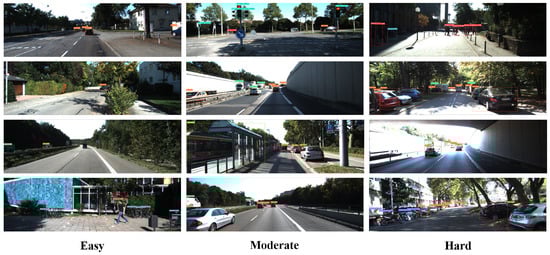 Table 5 shows the accuracy data for the Cyclist with the IoU set to 0.5 in three kinds of occlusion truncation (Easy, Medium, Hard). By comparing the results of the binary target detection groups (rows 3–7), the accuracy of our proposed IR-DC Net for detecting a cyclist in medium occlusion improves by 1.25%. The results of Cyclist and Pedestrian in different methods are shown in Figure 8.