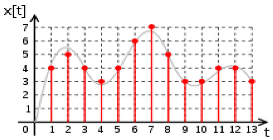 The discrete signal represents a digital signal, now familiar in CD music and text/videos on the Internet, consisting of a sequence of samples as digital packets, which are integer values. They could also be rationals, at rational values.