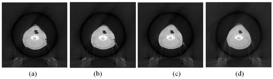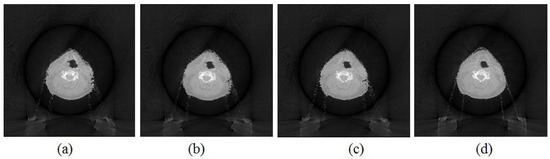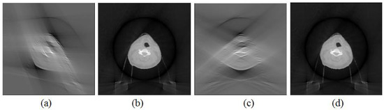 The influence of the scan orientation on the image quality was also investigated. The images that were reconstructed with the FDK method and the proposed method with a 0° scan orientation and a 60° scan angle are shown in Figure 2b,c. The images that were reconstructed with both methods with a 45° scan orientation and a 60° scan angle are shown in Figure 5a,b, while the images that were reconstructed with both methods with a 90° scan orientation and a 60° scan angle are shown in Figure 5c,d. The images as shown in Figure 3a–c that were reconstructed with the FDK method with three scan orientations were significantly different. The images as shown in Figure 2c and Figure 5b,d that were reconstructed with the proposed method with three scan orientations were similar to each other. This indicated that the influence of the scan orientation on the image quality of the reconstructed image was minor.