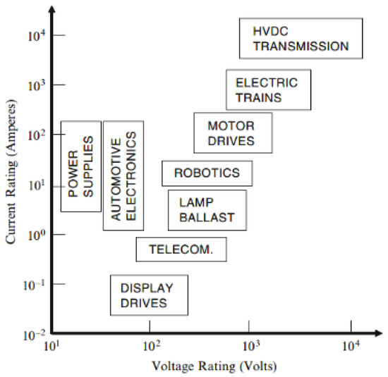 The power levels required by the applications used in power electronics are spread over a large spectrum, as shown in Figure 1. The first category is represented by the applications that use low current levels (around 1A), such as display drives. The second category includes devices that use a small supply voltage (less than 100 V). Automotive electronics and power supplies used in computers represent some examples within this category. The most suitable power device here is the silicon power MOSFET due to its fast switching time and low ON-state resistance. The third category is represented by power devices that use high operating voltages (more than 200 V). Consumer appliances, electric vehicle drives, and lamp ballasts are some typical examples for this category [4]. Considering the previous information, it is generally accepted that any switch that can pass a minimum current of 1 A is a power switch [5].