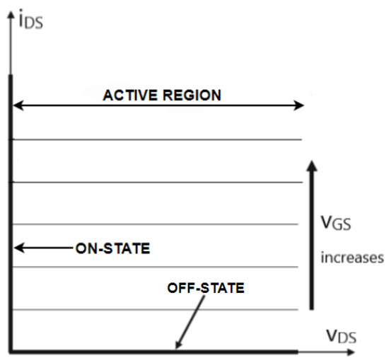 Figure 3 presents the ideal MOSFET power switch drain current vs. drain-source voltage family of characteristics iDS(vDS) at increasing gate voltages vGS as a parameter. The ideal MOSFET power switch is able to conduct current in the ON state with a zero-voltage drop and has no leakage current during the OFF state when it blocks the voltage. In the active region, the ideal MOSFET power switch can operate at high current (iDS) and voltage (vDS). The characteristics are uniformly spaced in the active region, indicating that the gain is independent of the iDS and vDS [4,13].
