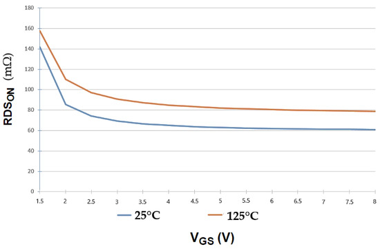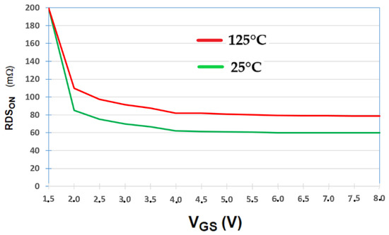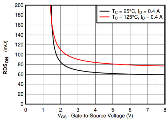 The ON-state resistance RDSON vs. Gate-Source voltage VGS characteristic of the CSD13380F3 transistor is presented in Figure 6. The characteristic was determined for a drain current ID = 0.4 A. It can be noticed that at low VGS voltage, RDSON has a higher value (200 mΩ) and decreases based on a square-root dependency until it reaches lower values (79 mΩ at 25 °C and 60 mΩ at 125 °C) at high VGS values (>8 V). RDSON decreases with the VGS increase because the drain current increases, but it saturates at high VGS voltages due to approaching the saturation region conditions. This dependency is mathematically explained in more detail by relations (3)–(7) in Section 4.