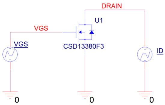 The starting point in building the new CSD13380F3 MOSFET model using the novel ON-state resistance modeling technique was the simulation of the transistor model provided by Texas Instruments. The model can be downloaded from Texas Instruments’ website [22] and it contains the CSD13380F3 symbol for Orcad Capture (with the extension .olb) and the library file for PSpice Allegro simulator (having the extension .lib). Based on these two files, the simulation test-bench was built and it is used to determine the initial RDSON characteristics presented previously in Figure 6 and Figure 7. The simulation test-bench is displayed in Figure 8, which consists of the piecewise linear voltage source VGS, which sets the gate-source voltage of the MOSFET, the CSD13380F3 MOSFET symbol, and the piecewise linear current source ID that sets the drain current of the transistor.