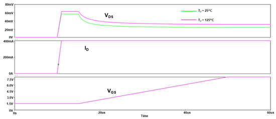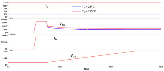 In the first setup, the gate-source voltage VGS is varied between 1.5 V and 8 V, while the drain current ID is set at 0.4 A. Two simulations are performed corresponding to two junction temperatures TJ (25 °C and 125 °C). The results are presented in Figure 9. It can be seen that the drain-source VDS is influenced by the junction temperature TJ.