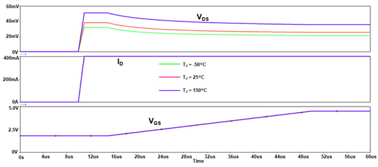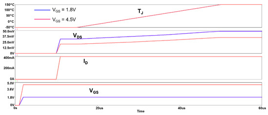 The same simulation test-bench presented in Figure 15 is used to determine the normalized RDSON vs. Temperature characteristics of the newly implemented model. For this setup, the drain current is set to 0.4 A and the temperature TJ is varied between −50 °C and 150 °C. Two simulations are performed for VGS = 1.8 V and VGS = 4.5 V. The waveforms are presented in Figure 18. It can be noted that the VDS voltage is influenced by VGS and TJ.