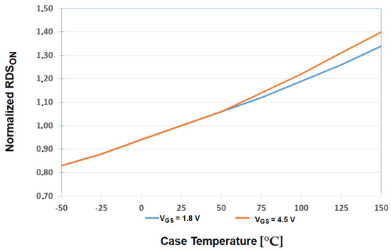 The normalized ON-state resistance RDSON vs. Case Temperature characteristic is shown in Figure 7, for two VGS voltages (1.8 V and 4.5 V) and a drain current ID of 0.4 A. In this case, the values are normalized to a temperature of 25 °C (value at a temperature of 25 °C is 1). It can be observed that the MOSFET RDSON increases with the case temperature. The dependency is determined experimentally based on laboratory measurements. The RDSON variation with the temperature is important because the load switches can be used in all types of environments (from cold to hot, as recommended in the manufacturer’s datasheet presented in Figure 7) and they also heat up to high temperatures during functioning at high switching currents.