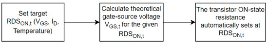 The novel ON-state resistance modeling principle is shown in Figure 13. The first step in the implementation of the above equations into the new model consists of setting the target ON-state resistance RDSON,t chosen by the user based on the catalogue data, which can be a function of temperature, VGS, and load current, depending on the information that the user has. Next step is the calculation of the theoretical drain gate-source voltage VGS,t based on the specified RDSON,t and the monitored drain current ID. When VGS,t is applied as the gate-source voltage, the transistor ON-state resistance automatically sets at RDSON,t.
