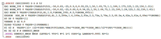 The PSpice CSD13380F3 model source code is presented in Figure 14. The voltage sources EA1, EA2, and EA3 are used to define the normalizing factor. Based on the normalizing factor, the target RDSON,t is set. The drain current ID is monitored through 0 V voltage source VSENSE. The RDSON,t and monitored ID are then used to define the target gate-source voltage VGS,t. A generic NMOS transistor is also used. Its parameters are not important, since the gate-source voltage automatically adapts in order to set the correct RDSON value.
