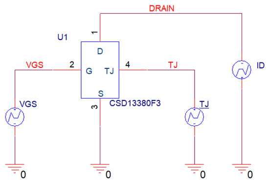 The OrCAD Capture simulation test-bench of the new CSD13380F3 MOSFET model is presented in Figure 15. Additionally, from the test-bench shown in Figure 8, there is a fourth pin, TJ, which is the device temperature as a voltage. The advantage of this implementation is that the temperature can vary during the simulation and emulate the self-heating effect, which plays an important role in load switches. The same steps as for the Texas Instruments’ model are applied. For the RDSON vs. VGS characteristic, the current source is set to 0.4 A and the VGS voltage source is swept between 1.5 V and 8 V.