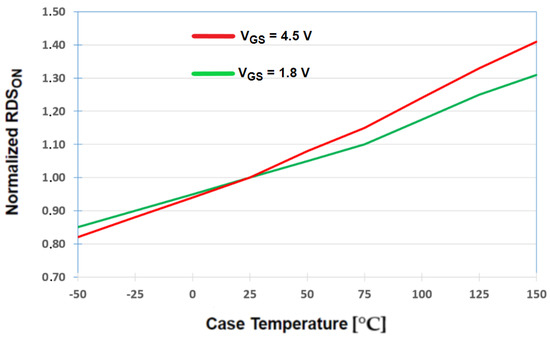 Figure 12 presents the normalized RDSON vs. Case Temperature characteristics for Texas Instruments’ CSD13380F3 MOSFET model, drawn based on results shown in Table 2. It can be seen that until 50 °C, the two curves for VGS = 1.8 V and VGS = 4.5 C are identical and only separate at temperatures above 50 °C. Looking at the theoretical characteristic presented in Figure 7, the two curves are different in each temperature point, except at 25 °C (due to normalization of the results to the 25 °C temperature). The relative errors for the temperature of −50 °C are 2.4% at 1.8 V and 2.3% at 4.5 V, while for the temperature of 150 °C, the relative errors are 2.29% at 1.8 V and 0.7% at 4.5 V.