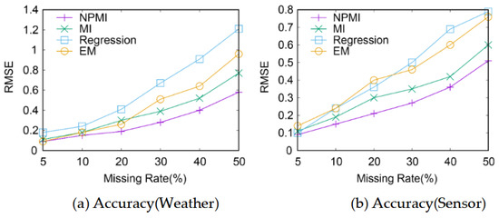 As shown in Figure 1, the RMSE error of the NPMI imputation algorithm proposed in this section is approximately the smallest on the above two real datasets (Weather and Sensor), that is, the imputation accuracy of the NPMI imputation algorithm is the highest. The ordinary MI filling algorithm has the second-best effect, the EM imputation effect is the second best, and the regression imputation effect is the worst. This is because NPMI imputation considers the distribution of data and the uncertainty of missing data; EM imputation is an iterative imputation method, which can obtain a relatively good imputation accuracy through several iterations. However, regression imputation requires linear relationships between variables, while the relationship between complete variables and missing variables in real datasets is more complex and cannot be accurately described by linear models. In some cases, the variables in the dataset are obviously not linear, so the imputation accuracy of regression imputation is not satisfactory.