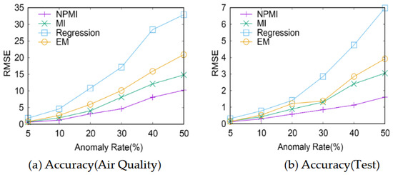 As shown in Figure 2, on the synthetic datasets (Air Quality and Test) with different noise ratios, the RMSE of the NPMI imputation algorithm proposed in this section is approximately the smallest, that is, the imputation accuracy of the NPMI imputation algorithm is the highest. As the proportion of noise increases, the RMSEs of the above four imputation algorithms all show an increasing trend, that is, the imputation accuracy is decreasing. This is because noise affects the data quality of the whole dataset. The higher the proportion of noise, the worse the data quality of the whole dataset.