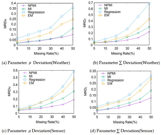 As shown in Figure 3, the relative deviations and values of the distribution of missing variables in the above two real datasets (Weather and Sensor) are approximately the smallest for the NPMI imputation algorithm proposed in this section, that is, the complete missing variables after imputation by the NPMI imputation algorithm can better reflect the distribution characteristics of missing variables in the real situation. It better reflects the uncertainty caused by missing data, and the distribution of missing variables after imputation is close to the real distribution of missing variables. Using theMI fill algorithm to fill after missing variable distribution deviation is relatively good. The other two fill algorithms used to fill after missing the distribution of the variable deviation are bigger, because the two fill algorithms, without considering the uncertainty of the missing data and overall uncertainty caused by missing data, only consider missing data to fill possible values. Therefore, there is a big difference between the distribution of missing variables filled by these two methods and the real distribution of missing variables.