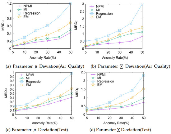 As shown in Figure 4, the relative deviation and sum of the distribution of missing variables in the two synthetic datasets (Air Quality and Test) proposed by the NPMI imputation algorithm in this section are approximately the smallest, that is, the distribution of missing data filled by the NPMI imputation algorithm is close to the real distribution of missing variables. It can better reflect the distribution characteristics of the missing variables in the real situation. The relative deviation of the distribution of missing variables after imputation by the MI algorithm is better than the other two imputation algorithms. The relative deviation of the distribution of missing variables after imputation by regression algorithm is the largest.