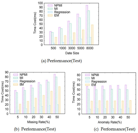 Figure 5a shows the comparison results of the execution efficiency of each algorithm on the synthetic dataset (Test) with different data volumes. It can be seen that under the same missing rate, the time cost of the above four filling algorithms all show an upward trend with the increase of data volume. In comparison, the execution efficiency of regression filling is the highest, followed by EM filling, and MI filling is close to that of the NPMI filling proposed in this paper, which consumes the most time. This is because the process of solving model parameters by linear regression padding is relatively simple, and the calculation process of EM padding and MI padding requires several iterations. In addition to the iteration that requires MI padding, NPMI padding uses the random sampling consistency method in the model initialization step, which is also an iterative method, so it consumes a lot of time, but on the whole, the time cost of NPMI is acceptable.