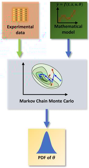 where is the relationship function between the time t, states , the input vector , parameters , and the output vector . In this scenario, if is a set of parameters. If they have a low predictive probability, the model will not provide a good forecast or adjustment to experimental data []. Thence, it is essential to know the model’s parameter probability density function (PDF) and, consequently, the model uncertainty to ensure that the model and the parameters are good enough.