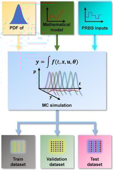 This paper proposes to build a training database by drawing a sample of the parameters of PDF and propagating it to the outputs of the non-linear model. In this way, the data used for training the models need to be representative of the operating conditions of the system and characterize the uncertainties of the non-linear model. Figure 3 presents a generic Monte Carlo Method (MCM) simulation scheme for synthetic data generation. The scheme in Figure 3 is inspired by the algorithm for implementing the Monte Carlo Method presented in Supplements 1 and 2 and to the “Guide to the expression of uncertainty in measurement” [,].