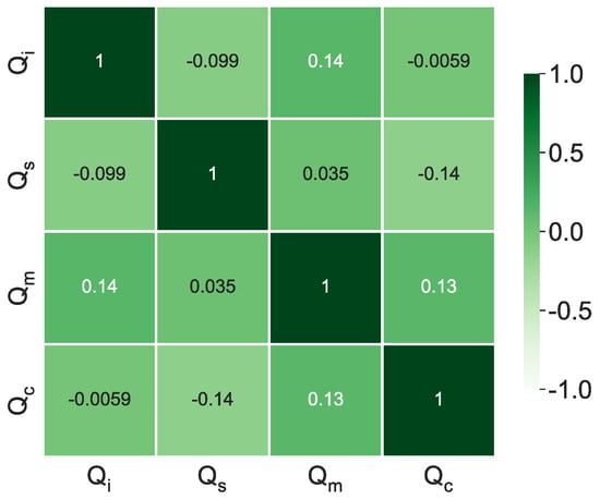 Figure 7 presents the correlation heat map for the variables set by the LHS. The main diagonal presents high correlations as it pairs the variables with themselves. In contrast, the pairing between the other entries produces a value that allows verifying if the generated values are uncorrelated. The lower these values, the less correlated they are. As shown in Figure 7, the correlations are close to null, demonstrating that the LHS can efficiently generate uncorrelated samples.