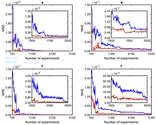 An important aspect to be analysed in neural network training is the guarantee of adequate training. In this sense, assessing whether the amount of information added in training the model is sufficient for the training algorithm to obtain a suitable model is necessary. Figure 10 shows this analysis for the polymer viscosity and reactor temperature. This evaluation was based on a set of independent training sets in which each one was repeated 25 times. The first 25 training sets were carried out with 100 experiments. The average values for MAE and the final MSE were calculated. For the next 25, 100 experiments were added, and so on. In Figure 10, it is possible to observe that for viscosity, after about 1750 experiments, there is no significant change in the MSE; however, for MAE, this value is about 1500. On the other hand, when the reactor temperature is evaluated, this value is higher, and more than 2500 experiments were needed for convergence. Thus, to ensure convergence, 3100 were used for both networks.