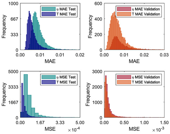 Convergence analysis of training networks via MC training can be performed by analysing MAE and MSE values similar to conventional training. However, given the number of trained networks, it is more convenient to evaluate in histogram format, as in Figure 11. In the first analysis, Figure 11 shows the histograms of the MAE and MSE indicators, both for the test and validation data. It is possible to observe that the histograms do not follow a Gaussian distribution. Thus, the mean may not be a good reference in statistical terms. Thus, Table 8 shows the minimum, maximum, median, and standard deviation of the MAE and MSE. Generally, it is possible to affirm that the networks converged sufficiently.
