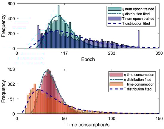 In the Monte Carlo Training process, an early stopping option in MC training was used to reduce the computational cost. Thus, training was aborted if there ewas no decrease in the LOSS value for 100 epochs. Figure 12 shows the histograms of the number of epochs trained during MC training for the two modelled variables. In the graph of Figure 12, the minimum number of epochs was 50, and the maximum number was 300. Lognormal distributions with lower or upper bounds should be the best representation for this data type. Figure 12 also shows that the data do not fit a lognormal distribution. Hence, no assumptions were made about the type of distribution of variables. Additionally, Figure 12 shows the distribution of each network’s time consumption during the Monte Carlo training process. With the early stopping option, the number of epochs trained is variable, and the time consumption during the training differs for each Monte Carlo trail. The training calculation through CM was performed using a computer with a dedicated Tesla T4 16 Gb GPU, two AMD EPYC 7252 processors, and 32 Gb of memory. The MC method can be parallelised when GPU processing is not used. Then, the training was carried out sequentially and totalled 155 h of training, which is the sum of all values presented in Figure 12.