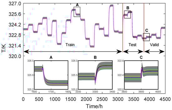 The last step of the proposed methodology is the propagation of uncertainty and methodology cross-validation. The proposal is based on constructing the uncertainty regions of the neural network’s prediction and comparison with the uncertainty regions of the non-linear phenomenological model. With the prediction values, it is possible to calculate the variance of the networks using the same assumptions used to calculate the uncertainty of the phenomenological model Equations (13)–(24). Figure 13 and Figure 14 show the comparisons between the predictions for the two modelled variables: T and .