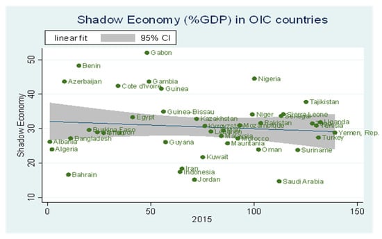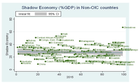 Here, in Figure 1, we notice that in the case of a sub-sample of non-OIC countries, the size of the shadow economy is approximately 30%, where most countries are again on the fitted line where the fitted line is significant at a 95% level of significance.